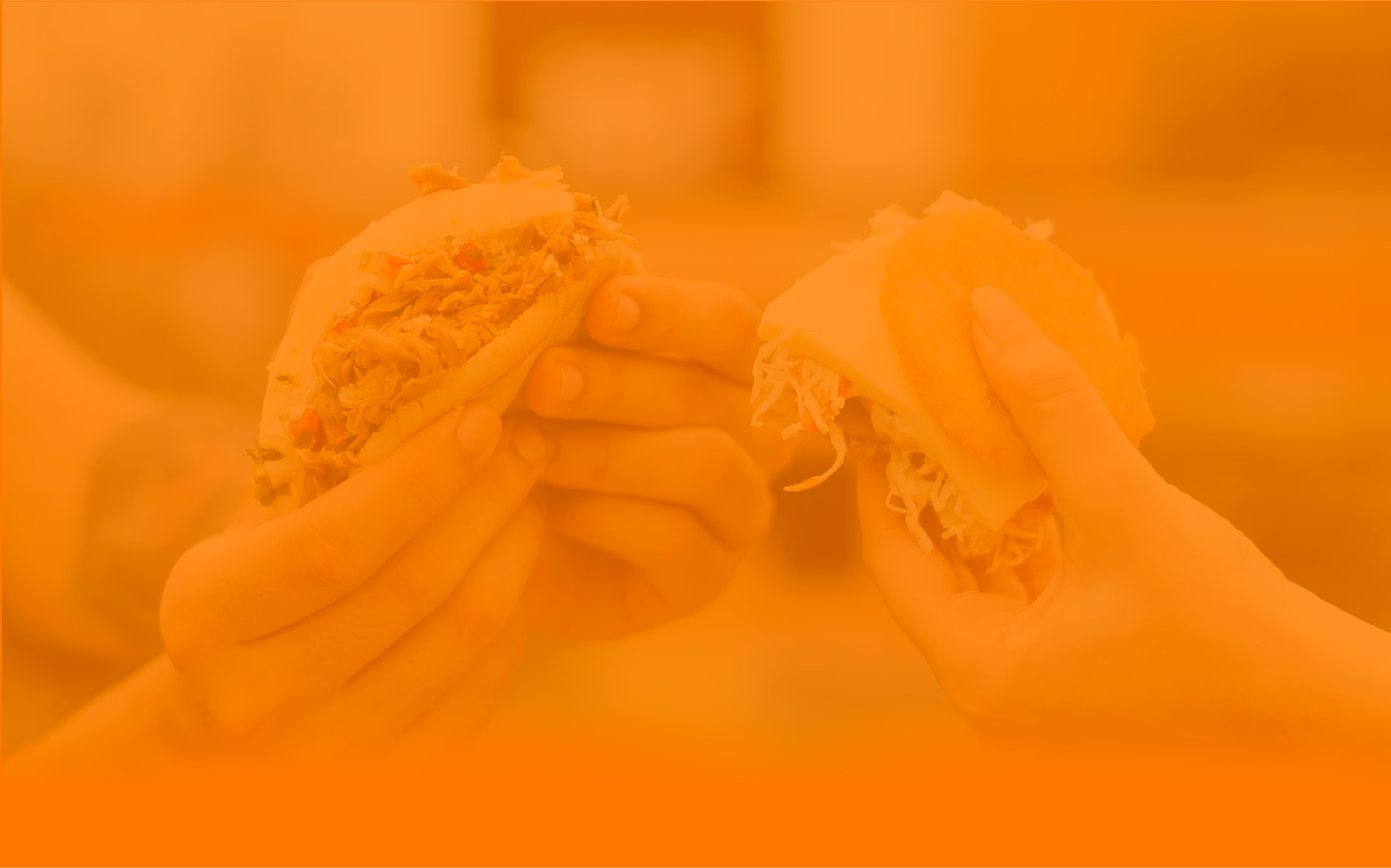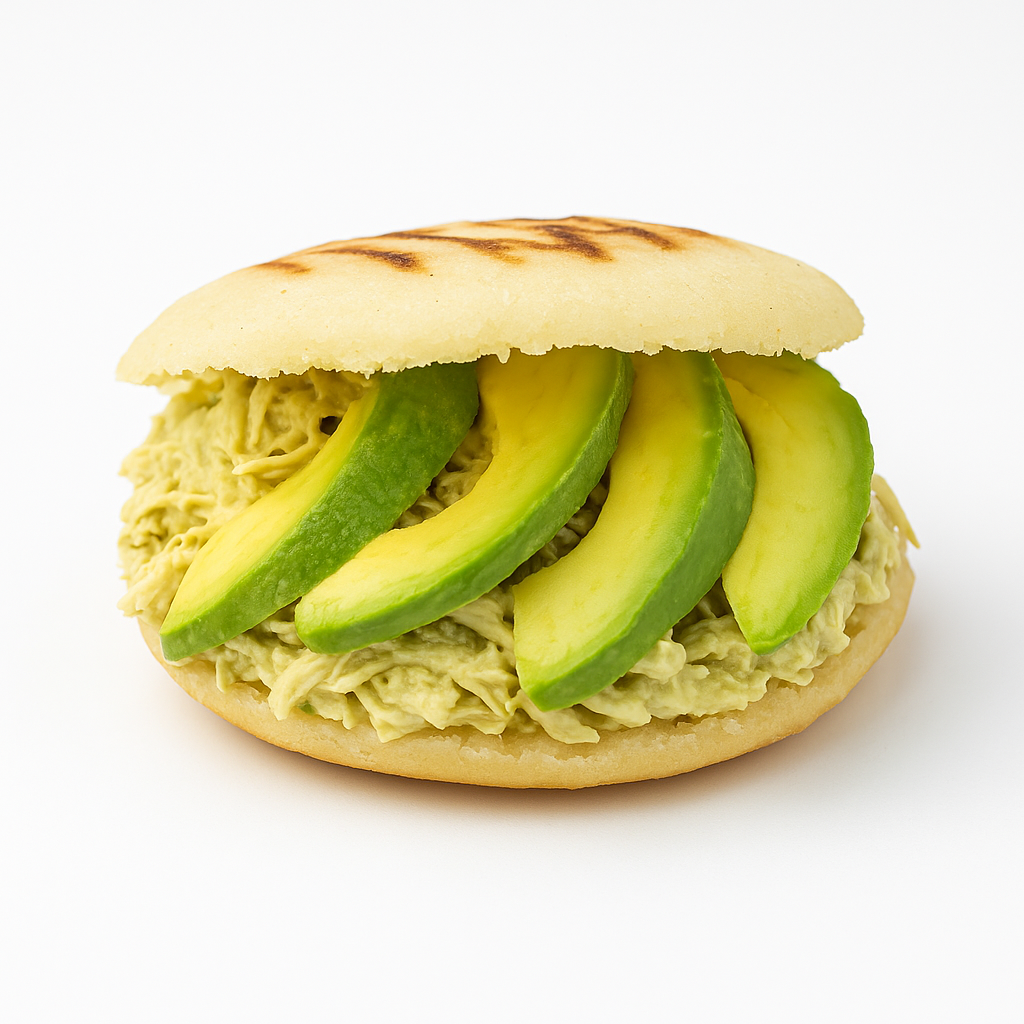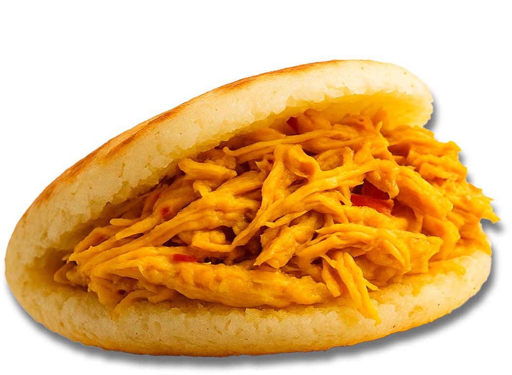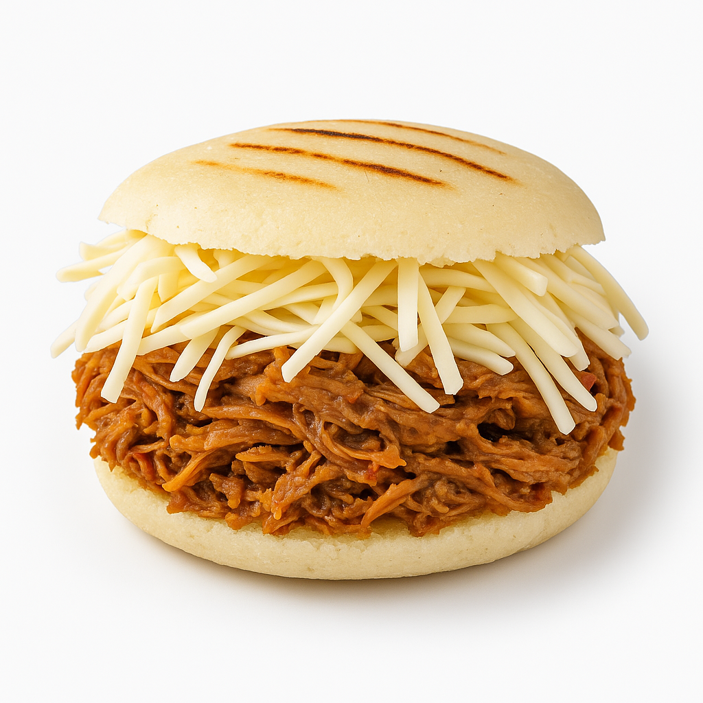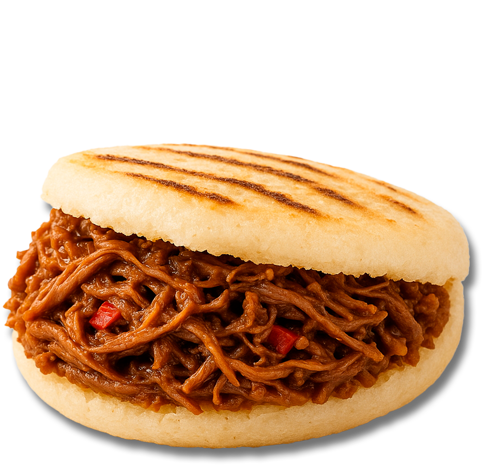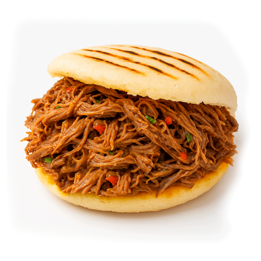 Crispy Pork Belly: A warm, crispy cornmeal pocket stuffed with juicy slow-cooked pulled pork, seasoned with traditional Venezuelan spices. Savory, tender, and packed with flavor in every bite